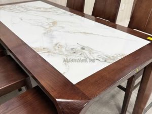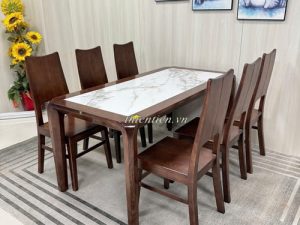 Tên sản phẩm: Bộ bàn ăn 6 ghế sồi mặt ĐÁ NHỎ (Ghế đầu cong)