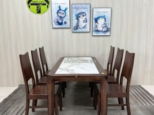 Tên sản phẩm: Bộ bàn ăn 6 ghế sồi mặt ĐÁ NHỎ (Ghế đầu cong)